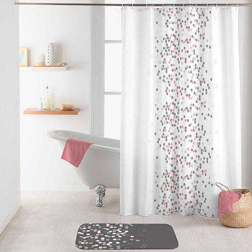Attraktivt Effervescence badeforhæng, der er fremstillet i vandafvisende 100% polyester og tåler vask ved 30 grader. Dette bruseforhæng fra hollandske Wicotex har forstærkede metaløjne til ophæng, så forhænget er nemt at udskifte og hænger sikkert derefter. Et badeforhæng der falder pænt, både når det er tørt og når det er vådt. Der medfølger 12 hvide plastringe til ophæng.