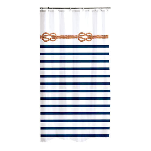 Maritimt badeforhæng, der er fremstillet i vandafvisende 100% polyester og tåler vask ved 30 grader. Dette bruseforhæng fra hollandske Wicotex har forstærkede metaløjne til ophæng, så forhænget er nemt at udskifte og hænger sikkert derefter. Et badeforhæng der falder pænt, både når det er tørt og når det er vådt. Der medfølger 12 hvide plastringe til ophæng. Du kan tilkøbe matchende bademåtte hertil.