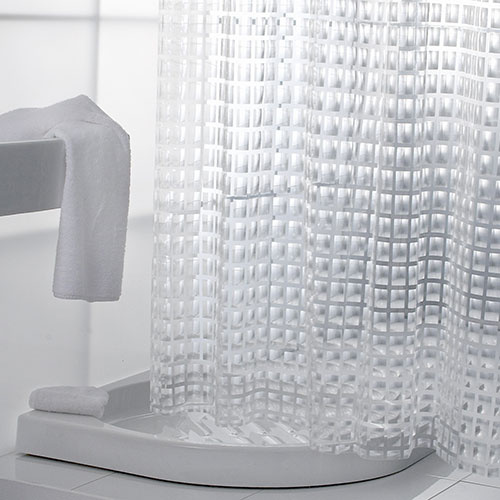 Topkvalitets badeforhæng i transparent og vandtæt design med 3D firkanter fra portugisiske Sorema. Et flot badeforhæng, som skaber ro til badeværelset og giver det noget elegance tidløst design. Bruseforhænget falder pænt og lysner op på badeværelset. Bruseforhænget er fremstillet i 100% økologisk korrekt EVA plast uden PVC, der hverken indeholder klorid eller cadmium.