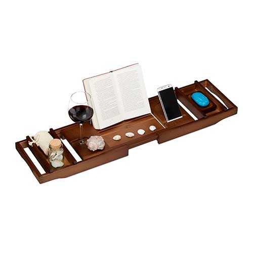 Dette luksus badekarsbord er ideelt for alle, der kan lide at hygge sig og slappe af i karret lidt længere. Slap af i badet i stearinlysets skær med et glas vin og en god bog, det kan man da kalde simpel wellness i topklasse. Bordet er fremstillet i bæredygtigt og miljøvenligt bambustræ med holder i rustfrit stål og kan justeres fra 75 cm. til 109 cm. i bredden, hvilket betyder at badekarsbordet passer til de fleste kar i standard størrelser. Tåler maksimal belastning på 5 kg.