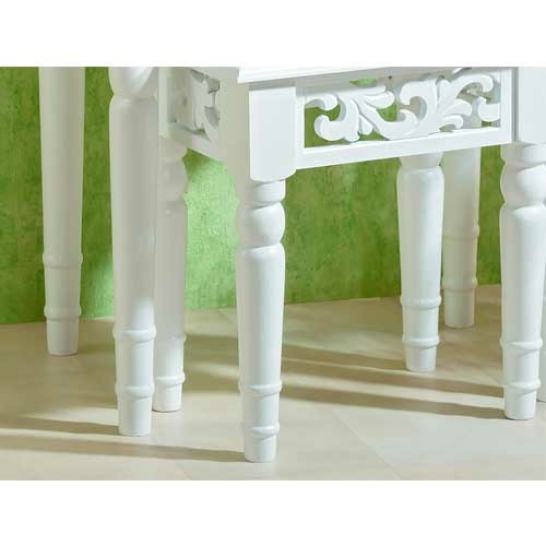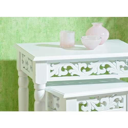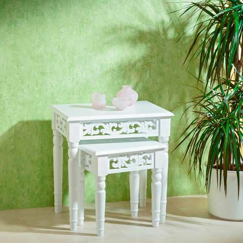 Kvalitets bordsæt i stilfuldt design. Bordsættet består af to matchende borde, der er fremstillet i massivt, hvidt træ og MDF-træ. Med dette bordsæt får du stilfuld opbevaringsplads til pynteting, magasiner, snacks, drikkevarer m.m. Anvendeligt i stuen, soveværelset, gæsteværelset, kontoret eller udestuen m.m. Ideel som sofabord, men kan også benyttes til blomster, som sengebord og meget andet. Smart, pladsbesparende løsning, hvor du kan skubbe bordene sammen og trække dem ud alt efter behov.