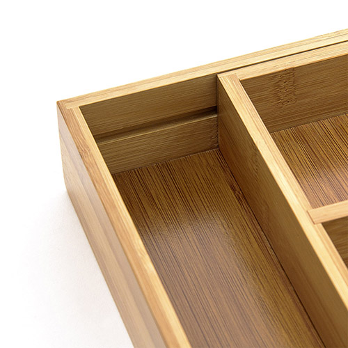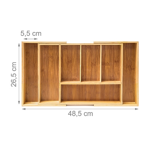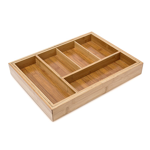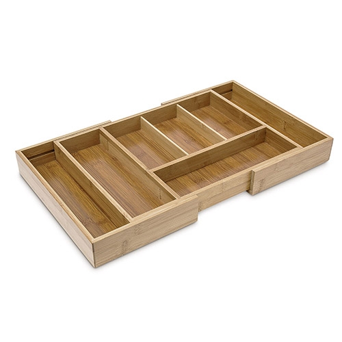 Praktisk og anvendelig bestikbakke i bæredygtigt og miljøvenligt bambustræ. Bestikbakken er justerbar og passer derfor til næsten alle skuffer. Det er muligt at trække de to sider fra hinanden og skubbe dem sammen alt efter behov. Bestikindsatsen er forsynet med 5-7 rum, hvor du kan placere dine knive, gafler, skeer, teskeer og pizzaskærer m.m.