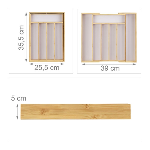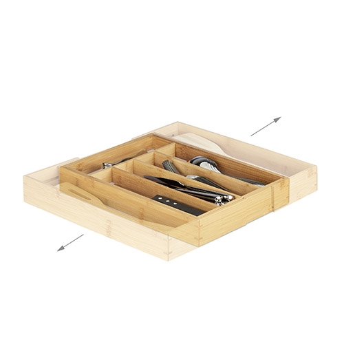 Stilfuld og anvendelig bestikindsats i bæredygtigt og miljøvenligt bambustræ med MDF bundplade. Bestikindsatsen er justerbar og passer derfor til næsten alle skuffer. Det er muligt at trække de to sider fra hinanden og skubbe dem sammen alt efter behov. Bestikindsatsen er forsynet med 5-7 rum, hvor du kan placere dine knive, gafler, skeer, teskeer og pizzaskærer m.m.