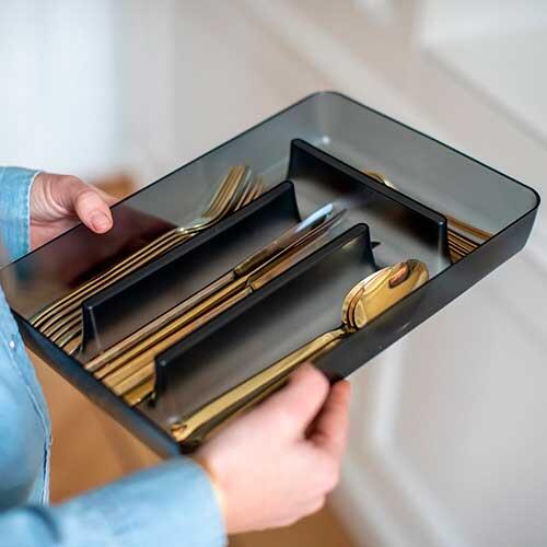 Praktisk Rio bestikbakke i robust termoplast fra tyske Koziol. Materialet er uden BPA og melamin. Bestikbakken er forsynet med 4 rum, hvor du kan placere dine knive, gafler, skeer, teskeer og pizzaskærer m.m. efter behov. Passer ned i de fleste skuffer og er tilmed meget let at rengøre, da den tåler opvaskemaskine.