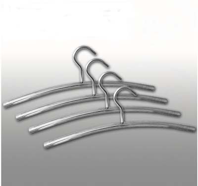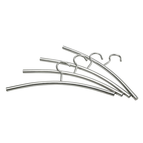 Fremstillet i rustfri stål. Vægt pr. bøjle ca. 60 gram. Velegnet til garderobestang med en tykkelse på op til 40 mm. Længde på bøjle ca. 44 cm. med en stang diameter på ca. 15 mm.