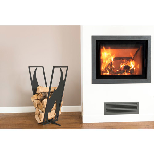 Lækker brændeholder i stilfuldt, minimalistisk sort design. Fremstillet i stål med en tykkelse på 1,5 cm. med slidstærk pulverlakering i sort. Træ motivet måler 1,5 mm. i tykkelsen. Meget let og super stabil brændeholder, der passer ind i ethvert hjem.