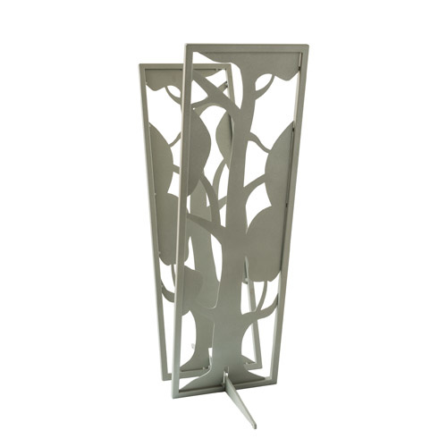 Lækker brændeholder i stilfuldt, minimalistisk grå design. Fremstillet i stål med en tykkelse på 1,5 cm. med slidstærk pulverlakering i grå. Træ motivet måler 1,5 mm. i tykkelsen. Meget let og super stabil brændeholder, der passer ind i ethvert hjem.