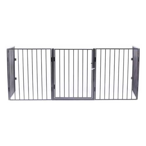Praktisk brændeovnsgitter til vægmontering, der er fremstillet i pulverlakeret metal med sort lakering. Velegnet til brug foran brændeovn, kamin, pejs el. lign. Hindrer børn og husdyr i at komme for tæt på og brænde sig på varme dele. Forsynet med dør, så man let kan komme forbi gitteret uden at kravle over.