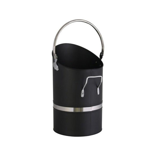 Træpillebeholderen er fremstillet i sort metal med stål håndtag og bånd.