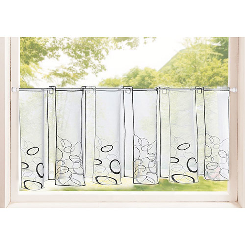Færdigsyet cafegardin i lækkert design af 100% polyester. Luftigt køkkengardin, der er flot dekoreret. Forsynet med huller til ophæng på gardinstang, der er klar til brug med det samme. Tåler vask ved 40 grader.