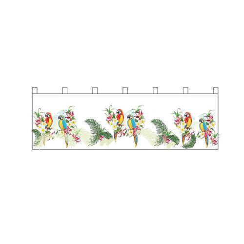 Færdigsyet cafegardin i lækkert, morderne design med digitalt fotoprint af papegøjer. Luftigt hvidt køkkengardin, der med sit tidløse design passer ind i ethvert hjem. Fremstillet i 100% polyester og forsynet med huller til ophæng på gardinstang, der er klar til brug med det samme. Egnet til gardinstænger med en maksimal diameter på 5 cm. Tåler vask ved 40 grader.