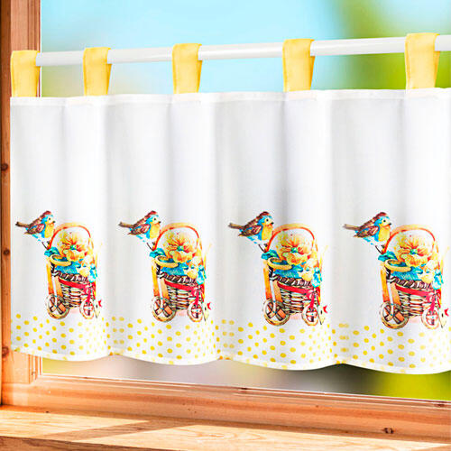 Færdigsyet cafegardin i dekorativt design med fugle motiv. Luftigt køkkengardin, der er fremstillet i 100% polyester og forsynet med huller til ophæng på gardinstang, der er klar til brug med det samme. Tåler vask ved 30 grader.