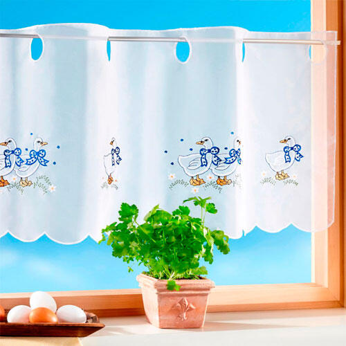 Færdigsyet cafegardin i dekorativt design med gæs motiv. Luftigt køkkengardin, der er fremstillet i 100% polyester og forsynet med huller til ophæng på gardinstang, der er klar til brug med det samme. Tåler vask ved 30 grader.