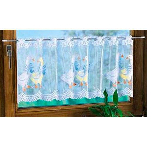 Færdigsyet cafegardin i dekorativt design med gæs motiv. Luftigt køkkengardin, der er fremstillet i 100% polyester og forsynet med huller til ophæng på gardinstang, der er klar til brug med det samme. Tåler vask ved 30 grader.
