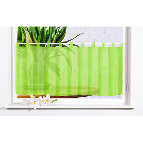 Færdigsyet cafegardin i lækkert design af 100% polyester. Luftigt grønt køkkengardin, der er forsynet med huller til ophæng på gardinstang og klar til brug med det samme. Tåler vask ved 40 grader.