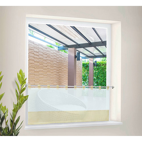 Færdigsyet cafegardin i lækkert design af 100% polyester. Luftigt hvidt og sandfarvet køkkengardin, forsynet med huller til ophæng på gardinstang, der er klar til brug med det samme. Tåler vask ved 40 grader. Den sandfarvede kant har en bredde på 15 cm.