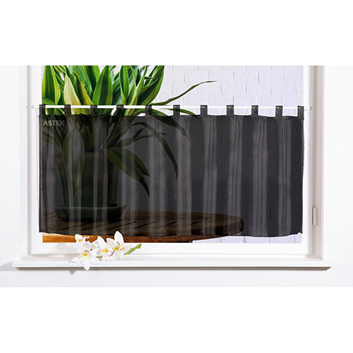 Færdigsyet cafegardin i lækkert design af 100% polyester. Luftigt sort køkkengardin, forsynet med huller til ophæng på gardinstang, der er klar til brug med det samme. Tåler vask ved 40 grader.
