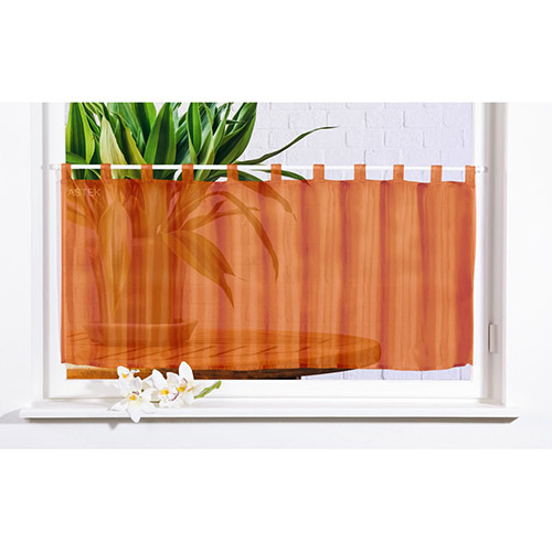Færdigsyet cafegardin i lækkert design af 100% polyester. Luftigt terracotta køkkengardin, forsynet med huller til ophæng på gardinstang, der er klar til brug med det samme. Tåler vask ved 40 grader.