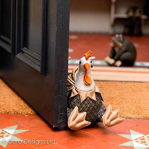 Utrolig nuttet Cornelius the Cockerel i brokade stof fra det populære Dora Designs med mange anvendelsesmuligheder. Designet af Angela Stevens og fyldt med en blanding af polyester og sand. Kan både benyttes som almindelig dørstopper, bogstøtte og som pyntegenstand/samleobjekt i hjemmet. Vejer ca. 1,5 kg. og det er i den grad et produkt man skal have i hænderne for at mærke den super gode kvalitet, der gør sig gældende.