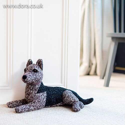Bedårende German Shepherd i boucle stof fra det populære Dora Designs med mange anvendelsesmuligheder. Designet af Angela Stevens og fyldt med polyester og sand. Kan både benyttes som almindelig dørstopper, bogstøtte og som pyntegenstand/samleobjekt i hjemmet. Vejer 1,4 kg. og det er i den grad et produkt man skal have i hænderne for at mærke den super gode kvalitet, der gør sig gældende.