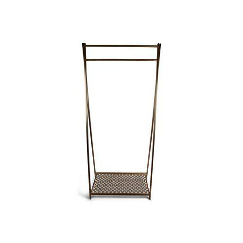 Stabilt og pladsbesparende Aron tøjstativ fra svenske Form Living til overtøj, tøj, sko og tasker m.m. Dette kvalitets tøjstativ er fremstillet i pulverlakeret metal i guld med to tværstænger i top og hylde i bunden. Særligt velegnet til mindre gangarealer, entré, soveværelse m.m. Benyt bøjlepladsen til jakker, skjorter og trøjer, mens du kan opbevare dine sko, handsker, tørklæder og tasker m.m. på hylden nederst. Passer sammen med skoreolen i samme design.