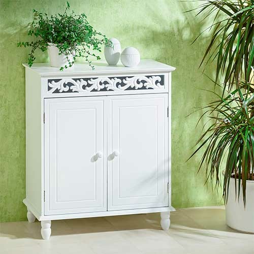 Kvalitets kommode i stilfuldt design, der er fremstillet i massivt, hvidt træ og MDF-træ med dekorativt mønster på fronten. Stabilt og praktisk design, der gør det til en fornøjelse at have i brug. Udstyret med hylde i midten, der eksempelvis kan benyttes til opbevaring i stuen, til badeværelsestilbehør eller til kontoropbevaring m.m. Velegnet til brug i stue, entré, værelse, garderobe og badeværelse m.m. Kommoden passer ind de fleste steder i hjemmet med dens stilfulde design.