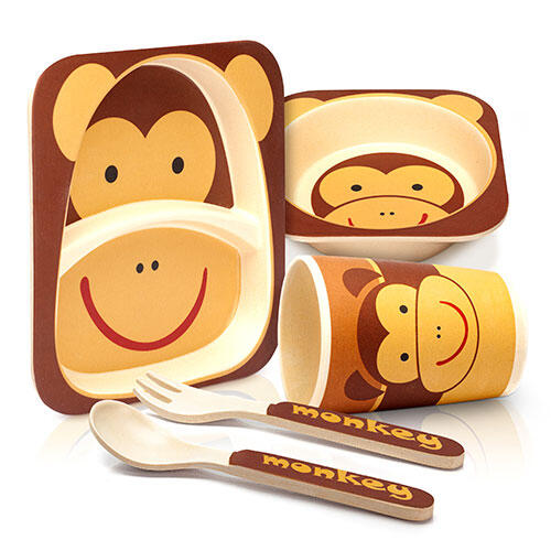 Gør ethvert måltid til en fest med dette børneservice sæt med glædeligt motiv fra tyske Bambuswald. Fremstillet i 80% naturlige materialer, heraf bambusfibre og majsstivelse, samt et lavt indhold af melamin. Sættet består af 5 dele, hvor du får tallerken, dyb tallerken, kop, ske og gaffel med afrundede kanter. Der er ingen risiko for personskade, da børnesættet er ubeskadiget efter langt de fleste fald fra bord- og stolehøjde. Også ideelt til børnefester og familieudflugter.