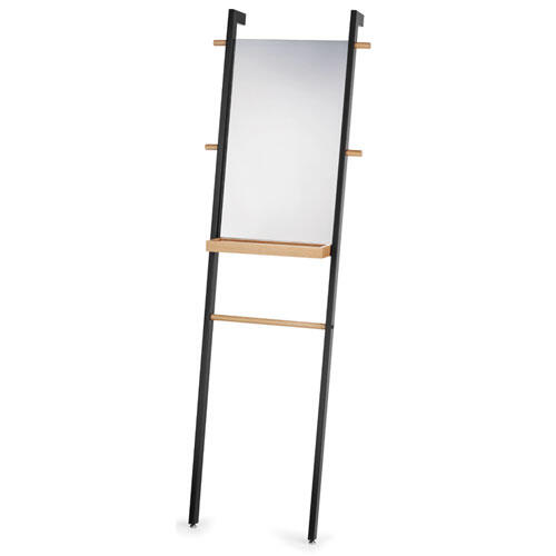 Topkvalitets håndklædestige i moderne, lækkert design fra Oak-serien, der kombinerer træ og metal på stilfuld vis. Fremstillet i solidt metal med sort mat pulverlakering, samt tværstænger i egetræ og med stort spejl med tilhørende hylde. Stigen er yderligere forsynet med skridsikre fødder og knager på siden til ophæng af håndklæder og tøj.