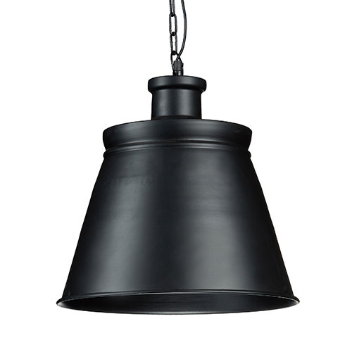 Moderne hængelampe i lækkert, industrielt design. Fremstillet i robust metal med mat sort lakering og rund baldakin i metal. Det slanke design, de rene linjer og det sorte finish gør, at lampen passer perfekt ind både i stue, køkken og kontor. Den store lampeskærm sikrer et behageligt og diskret lys.