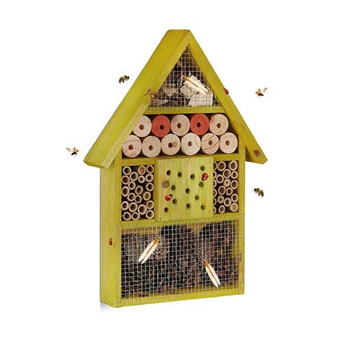 Insekthotel i træ til ophæng med vandbaseret grøn lakering og metalgitter, der er fyldt med fyrkogler, bambusrør og træ, som vil hjælpe dig med at bibeholde en sund økobalance i haven. Insekthotellet placeres tæt på pollenbærende træer, blomster og krydderurter og gerne i en højde på mellem 1,5-2 meter over jorden, hvor insekterne trives bedst. Placer gerne insektboet et sted, hvor det kan få meget sollys og knap så meget vind og regn. Særligt egnet til bier, mariehøns, biller og mange andre insekter.