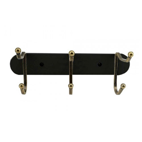 Praktisk brun knagerække i robust MDF træ, der er forsynet med 3 messingfarvede dobbeltknager i forkromet metal for øget stabilitet. Særdeles velegnet til garderobe, entré og bryggers ligesom den også kan benyttes til ophæng af håndklæder og badekåber på badeværelset m.m. Tåler maksimal belastning på ca. 6 kg.