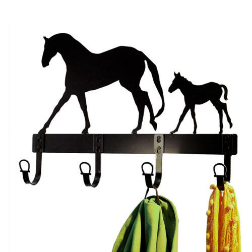 Dekorativ knagerække med hestemotiv i landlig stil. Knagerækken er fremstillet i pulverlakeret metal og udstyret med 4 knager til ophæng af overtøj, jakker, nøgler m.m. Velegnet til brug i gang, bryggers eller entré. Hurtig og nem montering.