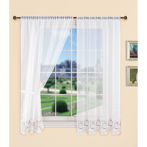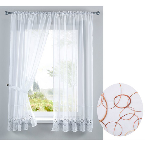 Komplet gardinsæt i lækkert design med brunt cirkel mønster. Luftigt hvidt og brunt gardin, der er flot dekoreret. Sidegardinerne er forsynet med huller til løbegang og stofholder i begge sider. Sættet består af 4 dele. Forsynet med ekstra gardinbånd til gardinstænger.