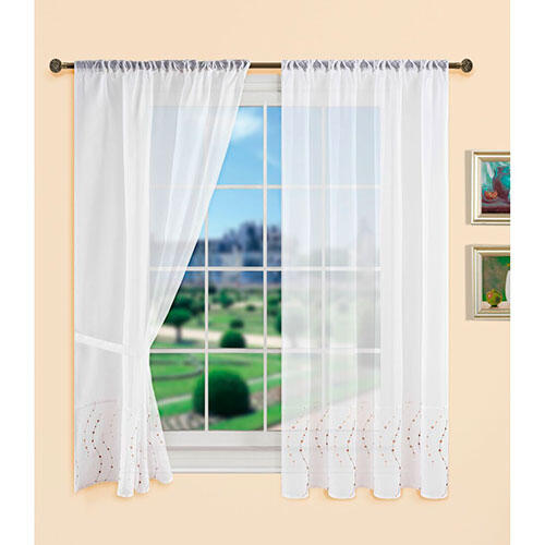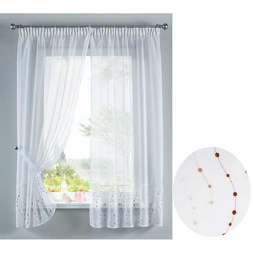 Komplet gardinsæt i luftigt design med brunt mønster. Sidegardinerne er forsynet med huller til løbegang og stofholder i begge sider. Sættet består af 4 dele. Forsynet med ekstra gardinbånd til gardinstænger.