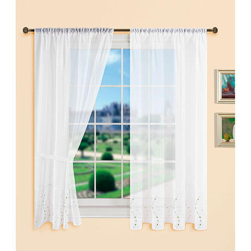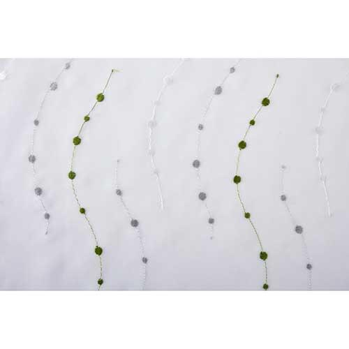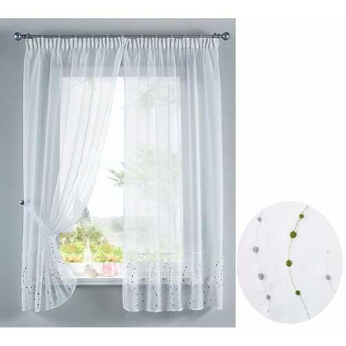 Komplet gardinsæt i luftigt design med grønt mønster. Sidegardinerne er forsynet med huller til løbegang og stofholder i begge sider. Sættet består af 4 dele. Forsynet med ekstra gardinbånd til gardinstænger.