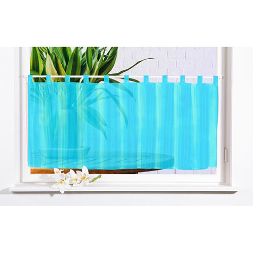 Færdigsyet cafegardin i lækkert design af 100% polyester. Luftigt turkis køkkengardin, der er forsynet med huller til ophæng på gardinstang og klar til brug med det samme. Tåler vask ved 40 grader.