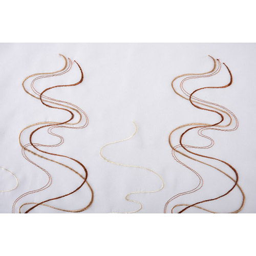 Færdigsyet cafegardin i lækkert bølge mønster. Luftigt hvidt og brunt køkkengardin, der er flot dekoreret. Forsynet med huller til ophæng på gardinstang, der er klar til brug med det samme. Egnet til gardinstænger med en maksimal diameter på 3 cm.
