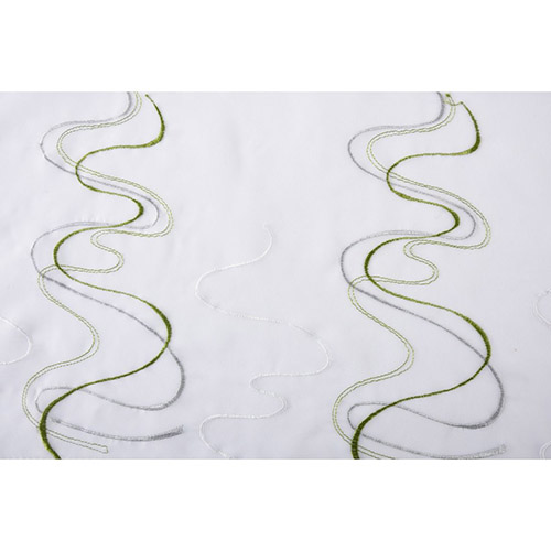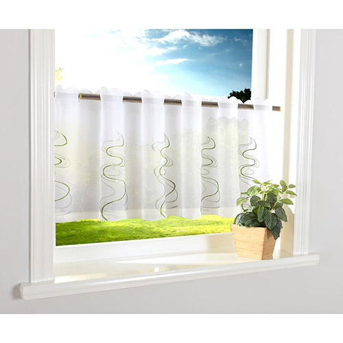Færdigsyet cafegardin i lækkert bølge mønster. Luftigt hvidt og grønt køkkengardin, der er flot dekoreret. Forsynet med huller til ophæng på gardinstang, der er klar til brug med det samme. Egnet til gardinstænger med en maksimal diameter på 3 cm.