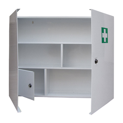 Stort højkvalitets medicinskab fra finske Pisla, der er fremstillet i ekstra kraftig stål med anti-rustbehandlet pulverlakering i hvid. Lågen er forsynet med grønt kors og lås med 2 nøgler. Dette robuste medicinskab er udstyret med tre hylder og ruminddeling, samt inderskab med ekstra lås. Skabet er ikke kun beregnet til at bringe orden i badeværelset, entre eller kontor, men samtidig en sikker og ordentlig måde til opbevaring af medicin m.m. Skabet placeres solidt på væggen, uden for børns rækkevidde. Yderst velegnet til både privat og professionel brug på badeværelset, kontoret, værkstedet, i sportsklubben m.m.