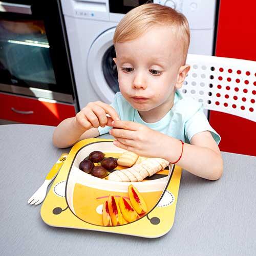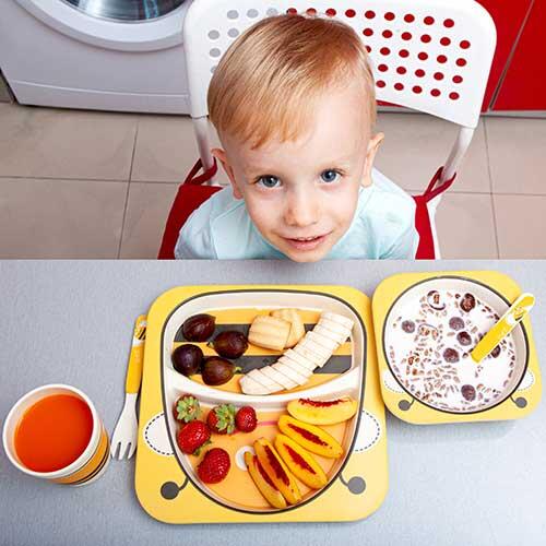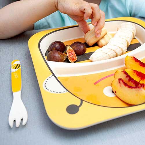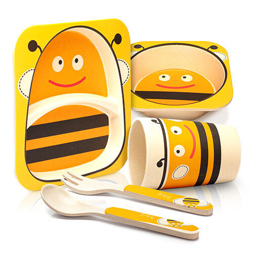 Gør ethvert måltid til en fest med dette børneservice sæt med glædeligt motiv fra tyske Bambuswald. Fremstillet i 80% naturlige materialer, heraf bambusfibre og majsstivelse, samt et lavt indhold af melamin. Sættet består af 5 dele, hvor du får tallerken, dyb tallerken, kop, ske og gaffel med afrundede kanter. Der er ingen risiko for personskade, da børnesættet er ubeskadiget efter langt de fleste fald fra bord- og stolehøjde. Også ideelt til børnefester og familieudflugter.