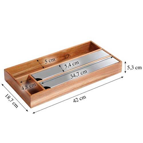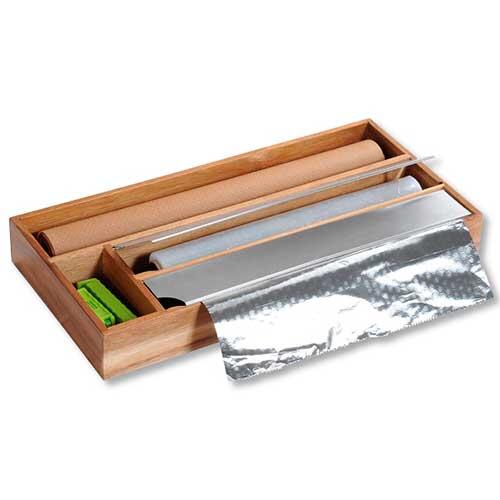 Smart og praktisk foliebakke med skær i naturskønt akacietræ med 100% FSC-certificering. Forsynet med fire rum, hvoraf de to rum har tilhørende skær til staniol og folie. Yderligere får du et rum til bagepapir, samt et opbevaringsrum til småting såsom klemmer el.lign.