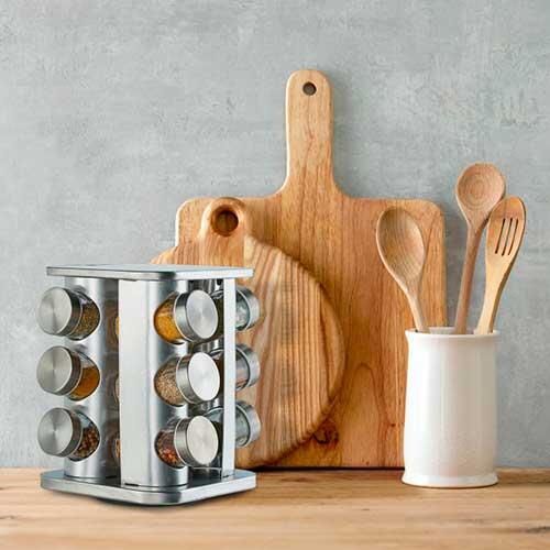 Lækre krydderier giver mange retter deres særlige charme. Her får du en moderne krydderikarrusel med 12 glas til opbevaring af forskellige krydderier. Fremstillet i robust rustfrit stål med drejbar fod. Få let overblik over dine krydderier og hold dem samlet på et sted. Velegnet til at have stående på køkkenbordet. Der medfølger 12 stk. strøglas med låg til krydderi opbevaring.