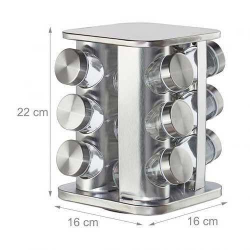 Krydderikarrusellen måler (H x B x D) 22 x 16 x 16 cm. Hvert glas måler (H x Ø) 9,5 x 4,5 cm. Vejer ca. 1,7 kg.