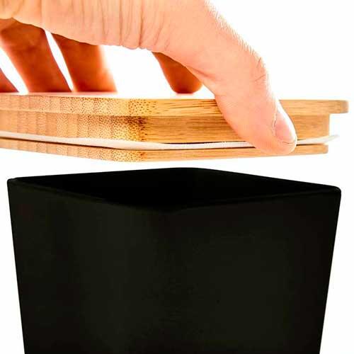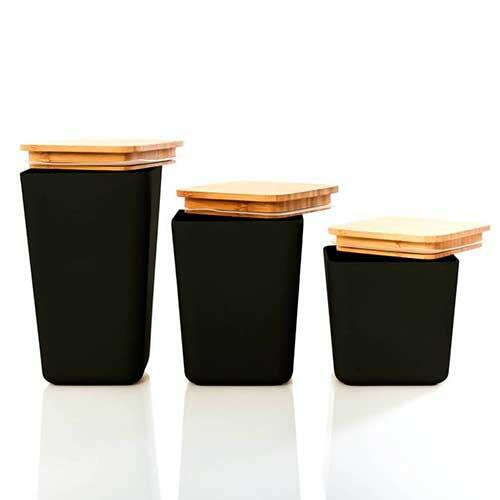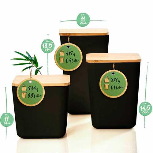 Lufttæt og miljøvenlig opbevaringsbøtte i sæt af 3 stk., der er fremstillet i en blanding af 70% bambusfibre, 15% majsstivelse og 15% melamin bindemiddel. Forsynet med låg i miljøvenligt bambus, der samtidig er forsynet med silikonering, der gør bøtten lufttæt. Dermed kan du opbevare dine bedste kaffebønner, pastaskruer, müsli og meget andet her.