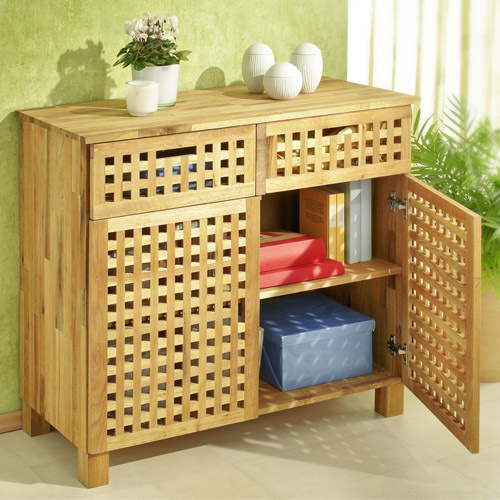 Kvalitets kommode med to skuffer og to låger i moderne optisk gitter design. Fremstillet i robust valnøddetræ, der har fået klarlak. Solidt og lækkert design, der gør den til en fornøjelse at have i brug derhjemme. Forsynet med to skuffer og to hylder med gode opbevaringsmuligheder, der eksempelvis kan benyttes til opbevaring i stuen, til badeværelsestilbehør eller til kontoropbevaring m.m. Velegnet til brug i stue, entré, værelse, garderobe og badeværelse m.m. Kommoden passer ind de fleste steder i hjemmet med dens naturlige design.