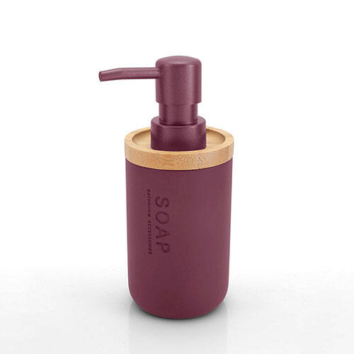 Attraktiv Nature sæbedispenser, der er fremstillet i en blanding af polyresin og bambus. Forsynet med pumpe, der nemt kan tages af, så sæbedispenseren kan genopfyldes. Produceret hos svenske Duschy og forsynet med teksten "Soap bathroom accessories".