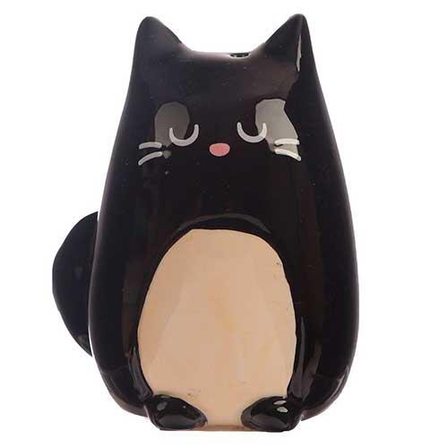 Dekorativt salt- og pebersæt med katte, der er fremstillet i porcelæn med blank glasur.