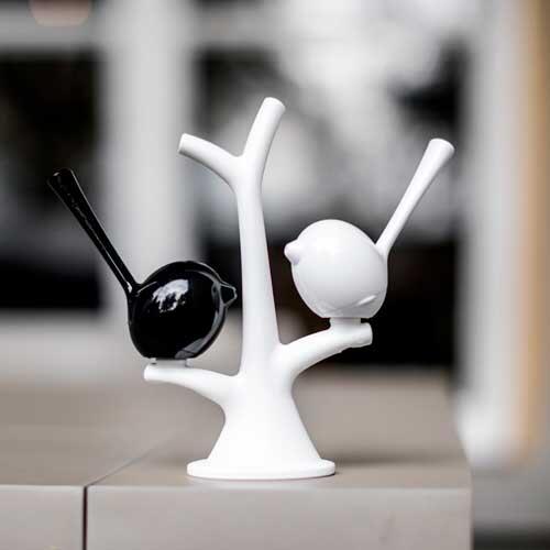 Et yderst charmerende sæt at have stående på spisebordet, der hurtigt fanger dine gæsters opmærksomhed. Fuglene påsættes ved hjælp af små magneter. Designet af Frank Person, Darmstadt. Tåler kun håndvask.