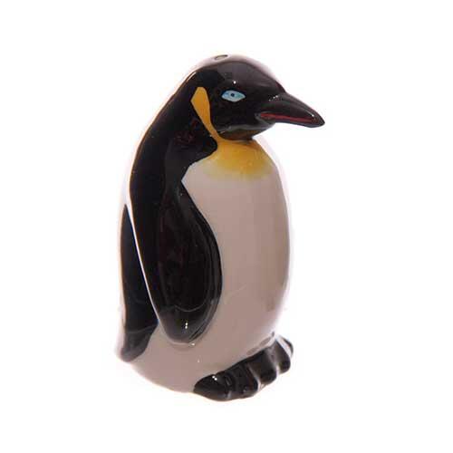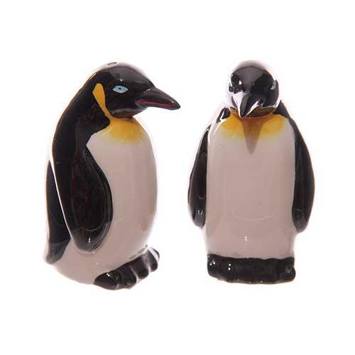 Dekorativt salt- og pebersæt med pingviner, der er fremstillet i porcelæn med blank glasur.