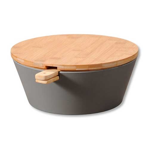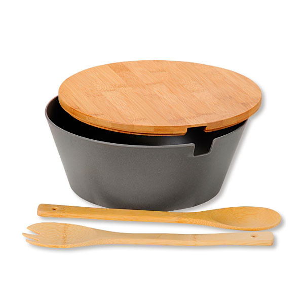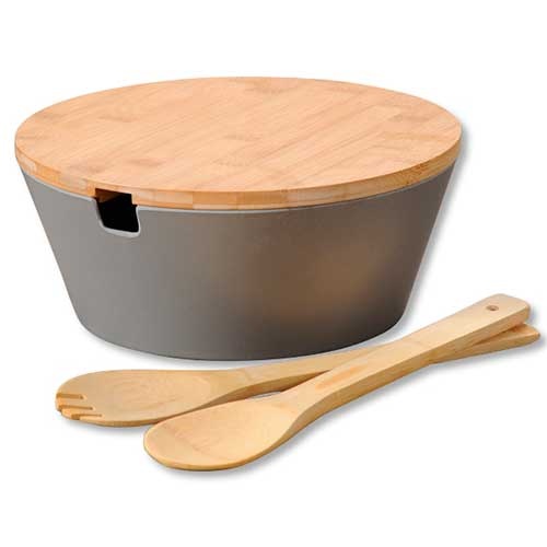 Kvalitets frugt-og salatskål i melamin plast med træbestik i bambustræ. Låg og bestik er fremstillet i bæredygtigt og miljøvenligt bambustræ med FSC-certifikat. Nydeligt sæt til servering på bordet. Tåler opvaskemaskine.